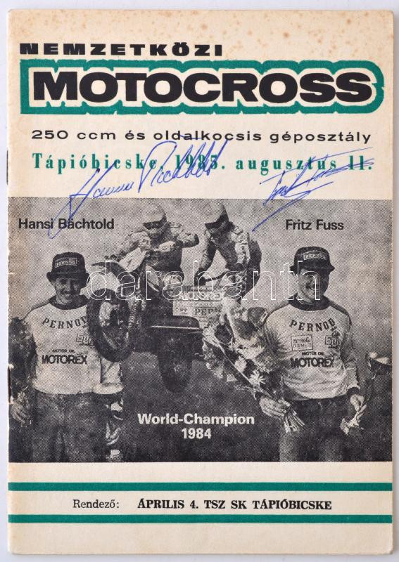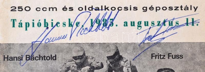 1985 Hansi Bächtold (1956- ) és Fritz Fuß (?- ) motocross világbajnokok aláírásai az 1985. évi tápióbicskei motocross programfüzeten