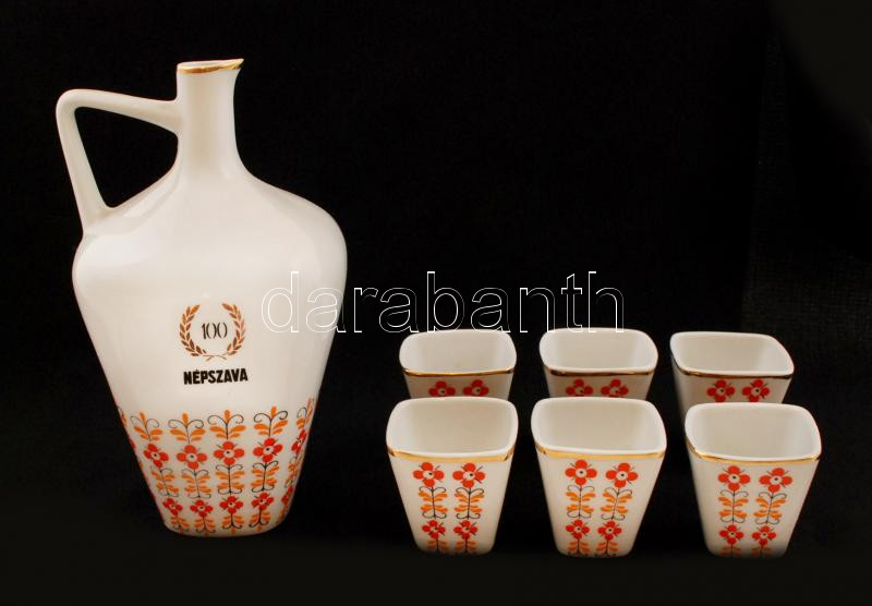 Hollóházi porcelán kiöntő Népszava felirattal + 6 db kupica, matricás,...