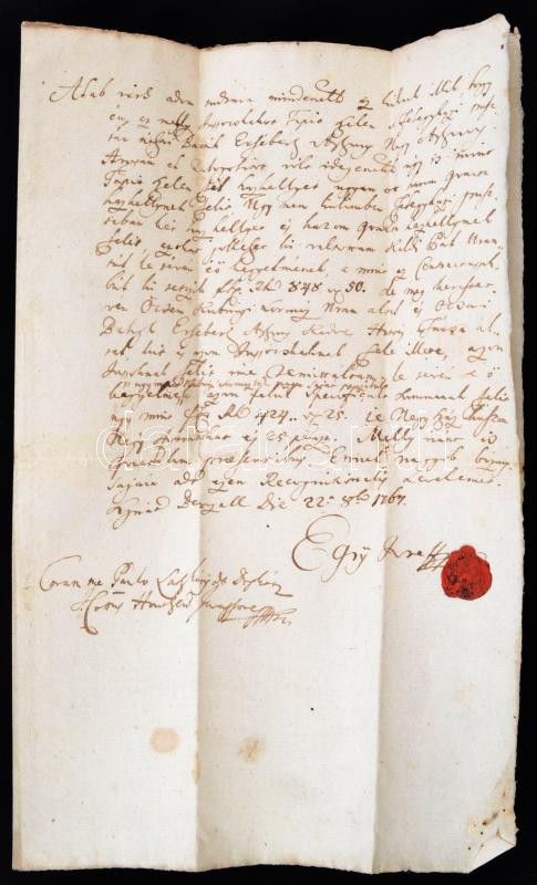 Description: 1767 Bercel (Nógrád vm.), Egry József (?-?) magyar nyelvű elismerőlevele különféle zálogainak kiváltásáról, rányomott viaszpecséttel, vármegyei hitelesítéssel