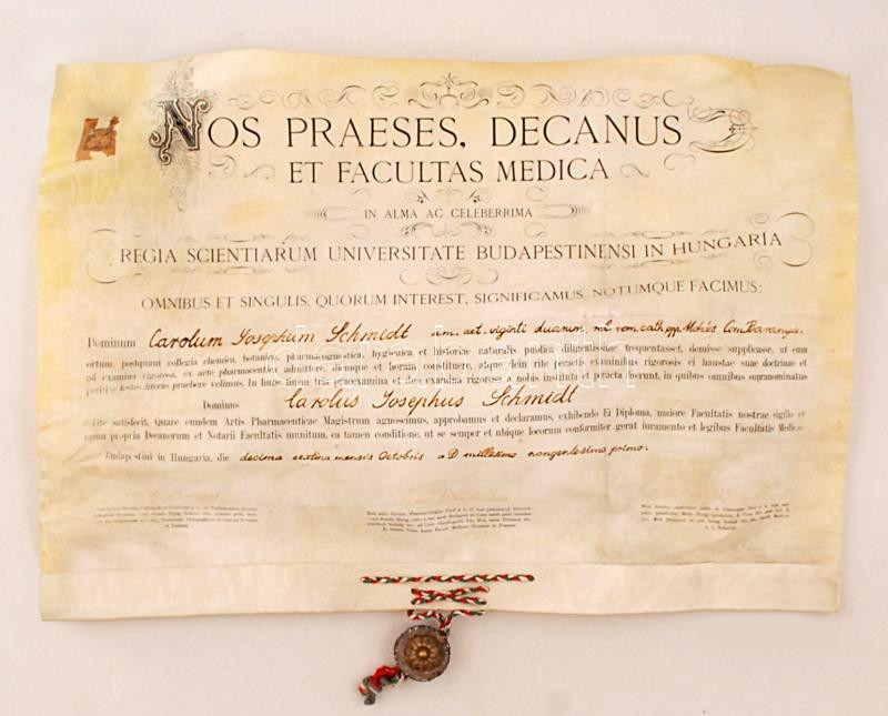 1901 Budapest, A Budapesti Egyetem által kiállított orvosi diploma függőpecséttel