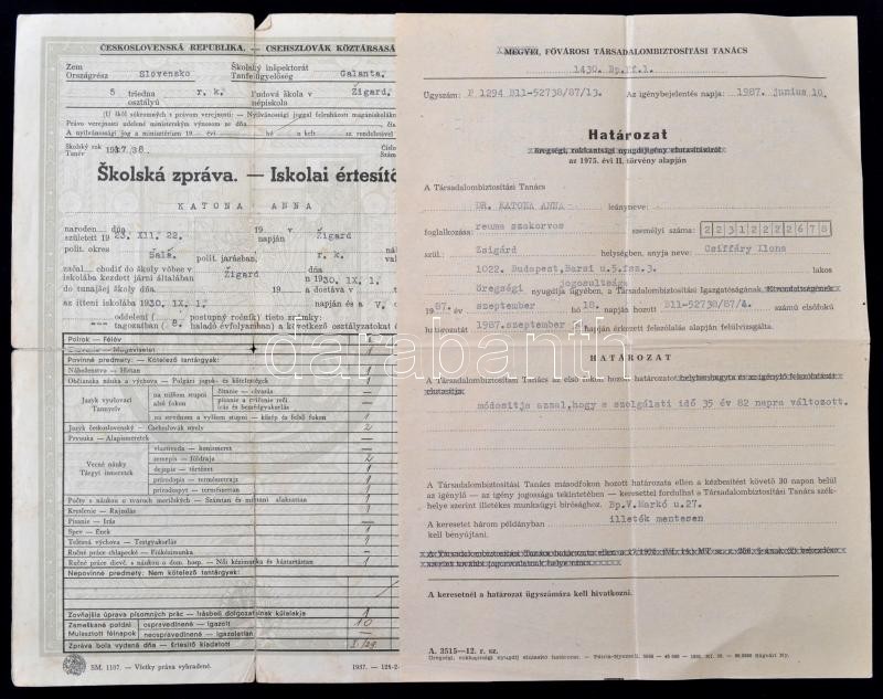 Description: cca 1943-1988 Vegyes okmány tétel(jegyzőkönyv, miniszterelnökség által kiadott határozat elbocsátásról, állampolgársági bizonyítvány, fizetési meghagyás, iskolai értesítő, működési bizonyítvány, stb.)