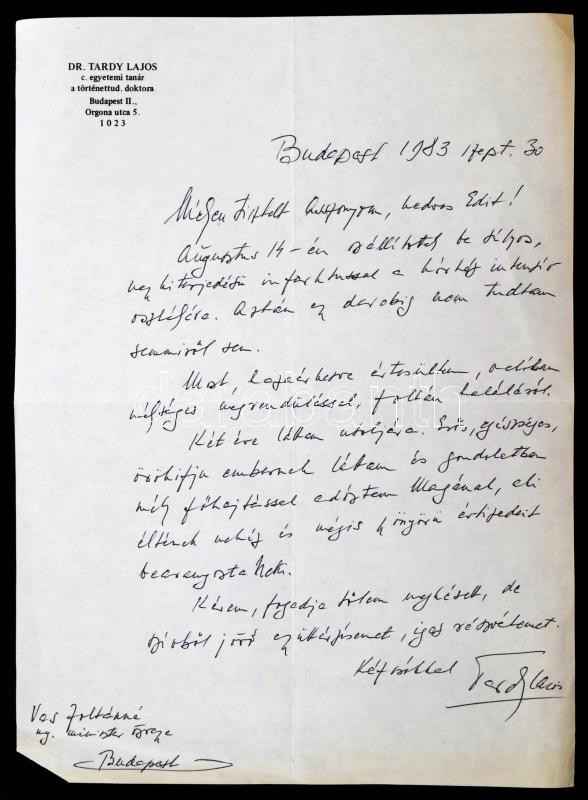 1983 dr. Tardy Lajos részvétnyilvánító levele Vas Zoltán (1903-1983) k...