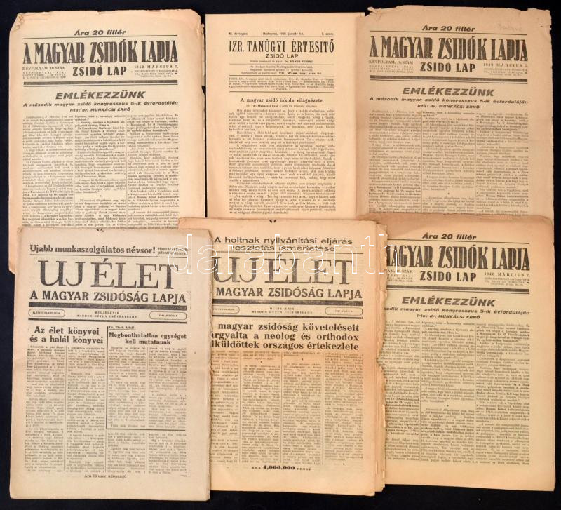 1940-46 Vegyes zsidó lap, 8db: Izr. Tanügyi Értesítő, A Magyar Zsidók lapja, Uj élet, stb, különböző méretben és minőségben