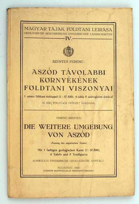 Szentes Ferenc: Aszód távolabbi környékének földtani viszonyai 1 földtani térképpel, 4 tábla 5 szövegközti ábrával. Magyar Tájak Földtani Leírása IV. Budapest, 1943. Stádium. Kiadói papírkötésben