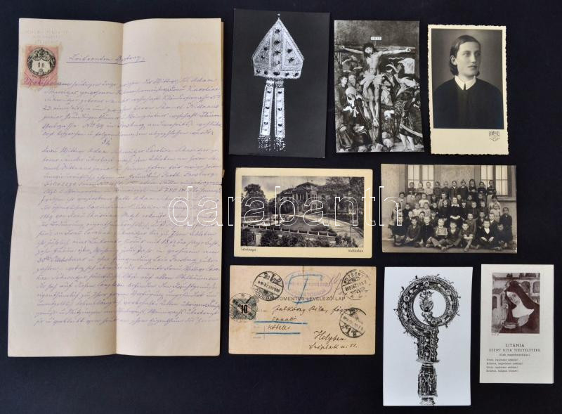 9 db. vegyes fotólap és irat Dr. Toma Imre tábori lelkész, későbbi esperes hagyatékából, Tatabánya, Tokod képeslapok, 1887-ben Pozsonyban kelt ügyvédi irat korabeli okmánybélyeggel, szárazpecséttel, korabeli Szent Rita litánia.