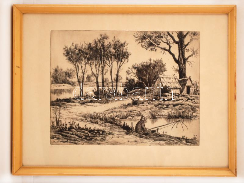 Gácsi Mihály (1926-1987): Halász. Rézkarc, papír, jelzett, üvegezett keretben, 29×39 cm