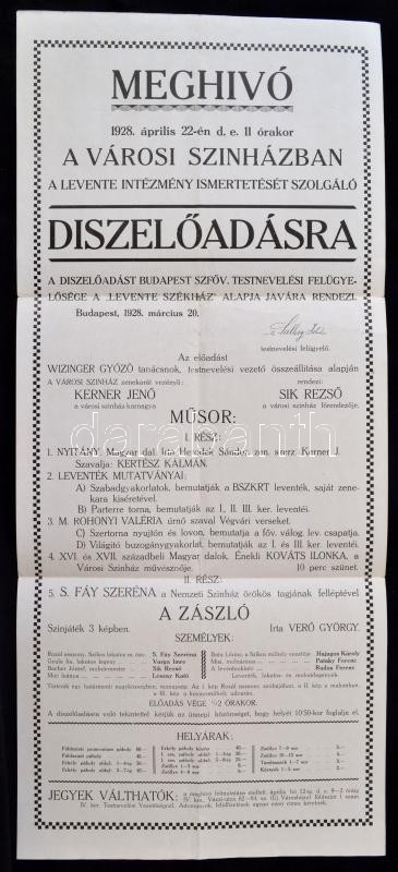 1928 Újpest. Meghívó és műsorplakát a Levente intézményt bemutató díszelőadásra. 55x25 cm