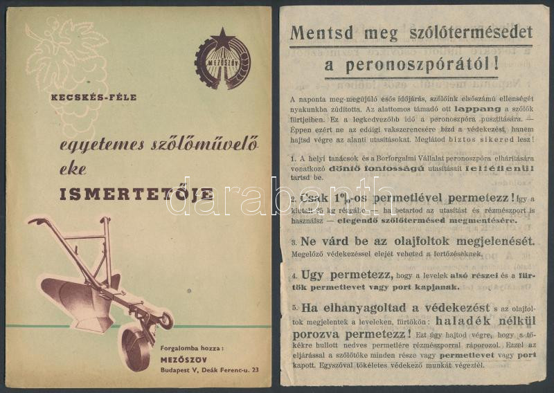 1953-1956 "Mentsd meg szőlőtermésedet a peronoszpórától!" szórólap + Kecskés-féle egyetemes szőlőművelő eke ismertetője