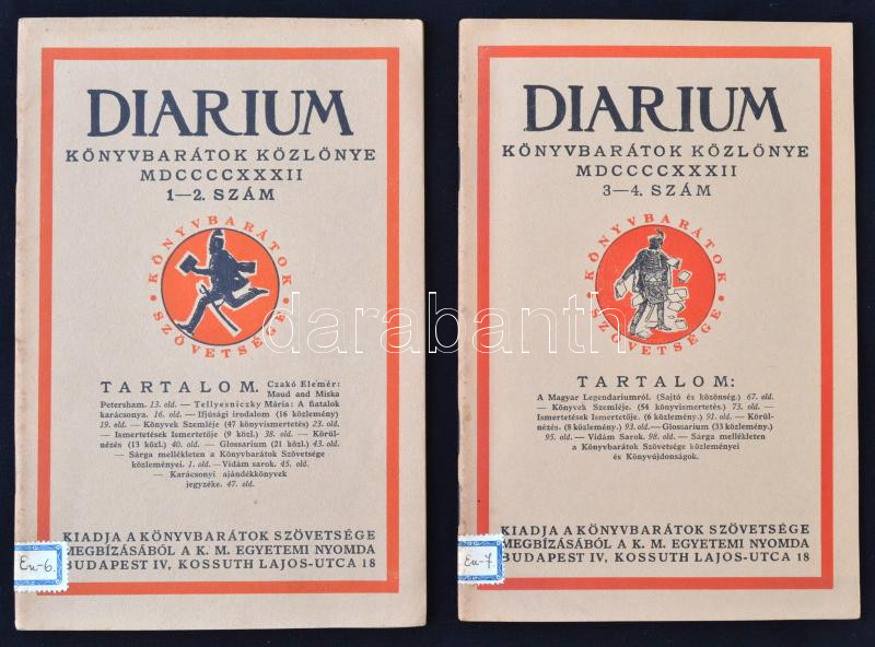 Diarium 1932. A Magyar Könyvbarátok Közlönyve MDCCCCXXXII 1-2. szám. ,... https://www.darabanth.com/en/270-Online-auction/270.0/Other-collectibles/Printed-Materials~4/Diarium-1932-A-Magyar-Konyvbaratok-Kozlonyve-MDCCCCXXXII-1-2-szam--3-4-szam-Budapest-19~II1354499