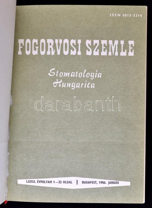 Description: Fábián Tibor(szerk.): Fogorvosi szemle - Stomatologia Hungarica. LXXIX. hiányos évfolyam. 1986.1-12. január-december. Budapest, 1986, Ifjúsági Lapkiadói Vállalat. Könyvkötői fél műbőr, 384 -33p. Teljes évfolyam! Hiányos évfolyam! Az 4. május 97-128 p. szám hiányzik!