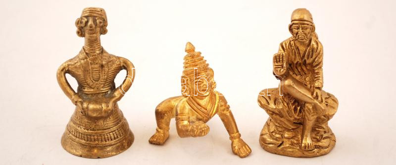 3 db festett kisméretű keleti fém szobrocska, az egyik jelzett, különböző méretben