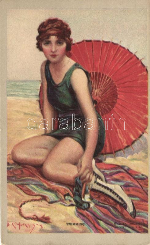 Swimming; Italian art deco postcard, beach life s: Chiostri