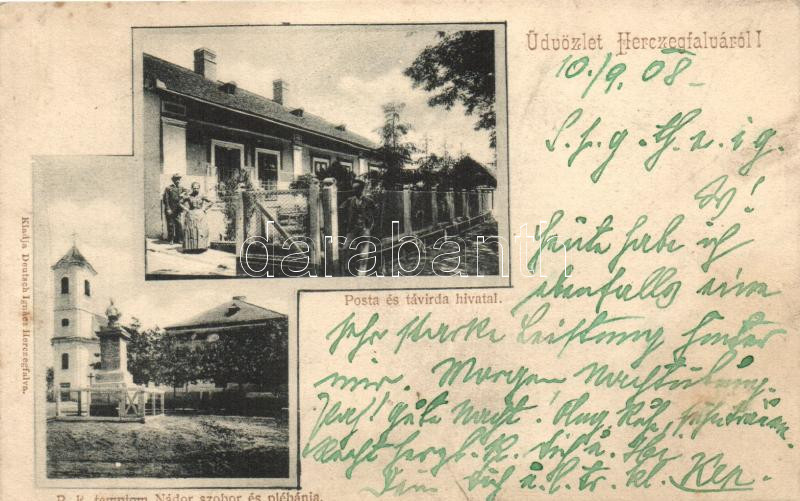Hercegfalva (Mezőfalva), Posta és távírda, római katolikus templom, nádor szobor, plébánia, kiadja Deutsch Ignácz