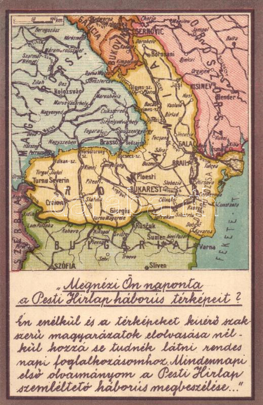 Megnézi Ön naponta a Pesti Hírlap háborús térképeit?; A romániai háború térképe; kiadja a Pesti Hírlap / Map of the Romanian war