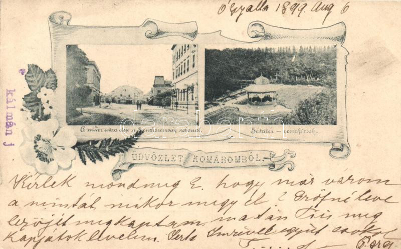 1899 Komárom, Komárno; Nádor utca eleje a Szentháromság szoborral, sétatér, zenekoiszk / street, statue, promenade, kiosk, floral
