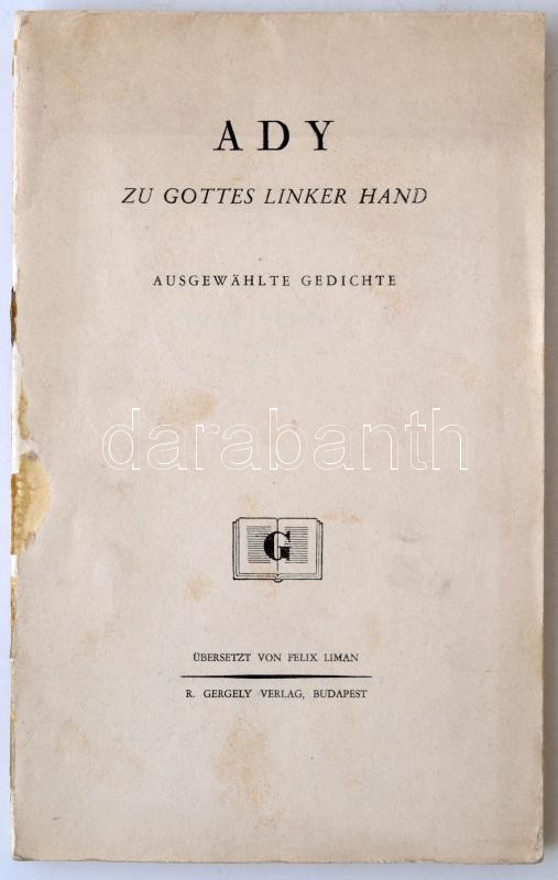 Ady: Zu Gottes Linker Hand. Ausgewahlt gedichte. Budapest, R. Gergely.... https://www.darabanth.com/en/271-Online-auction/271.0/Books/Books-Foreign-languages~43/Ady-Zu-Gottes-Linker-Hand-Ausgewahlt-gedichte-Budapest-R-Gergely-A-boritoja-hianyzik-de-a-~II1354715
