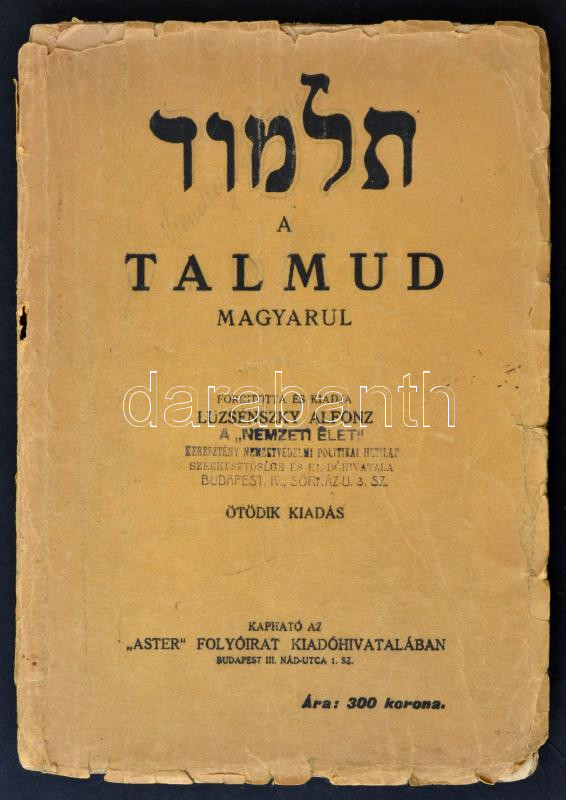 https://www.darabanth.com/en/271-Online-auction/271.0/Books/Books-Judaica~41/A-Talmud-magyarul-Ford-Luzsenszky-Alfonz-Bp-e-n-Stadium-Tuzott-papirkotesben-kiss~II1370202