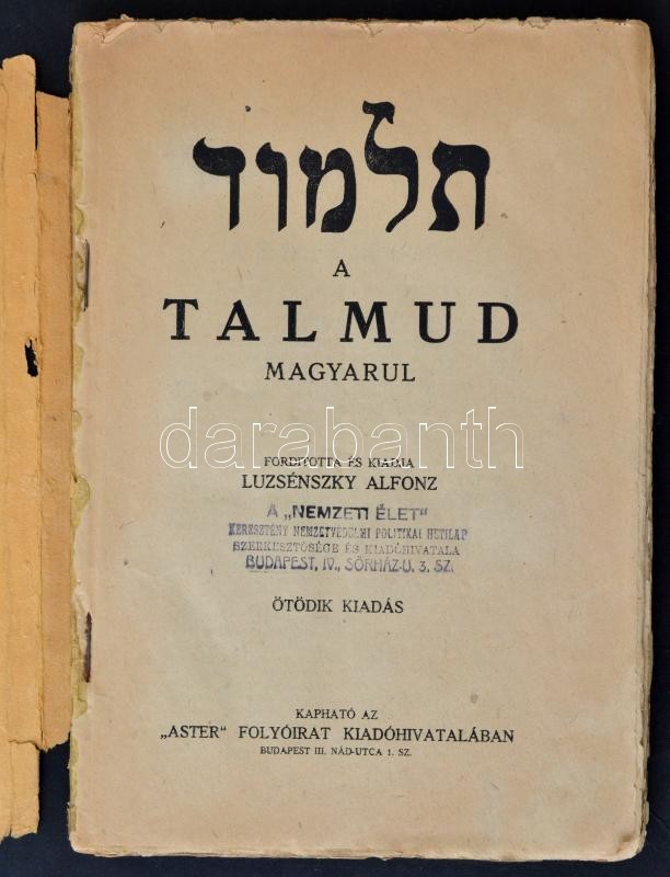 A Talmud magyarul. Ford.: Luzsénszky Alfonz. Bp., é. n., Stádium. Tűzö...