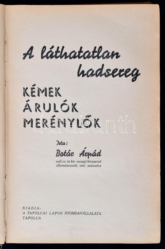 Botár Árpád: A láthatatlan hadsereg. Kémek, árulók, merénylők. Tapolca... https://www.darabanth.com/en/271-Online-auction/271.0/Books/Books-Military~36/Botar-Arpad-A-lathatatlan-hadsereg-Kemek-arulok-merenylok-Tapolca-en-Tapolcai-Lap~II1371103