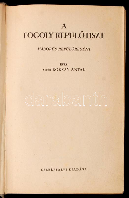 Vítéz Boksay Antal: A fogoly repülőtiszt. Budapest, é.n., Cserépfalvi, 301 p. Kiadói egészvászon kötés. A borítója kopott, foltos, megviselt.