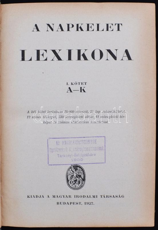 A Napkelet lexikona I. A-K. Bp., 1927, Magyar Irodalmi Társaság. Kiadó...