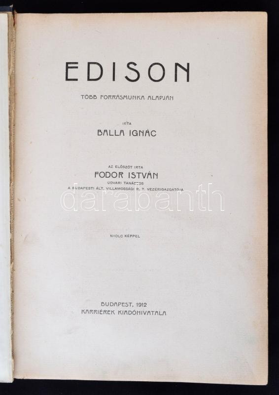 Balla Ignác: Edison. Több forrás munka alapján. Karriérek, Híres felta... https://www.darabanth.com/en/271-Online-auction/271.0/Books/Books-Other-rarities~46/Balla-Ignac-Edison-Tobb-forras-munka-alapjan-Karrierek-Hires-feltalalok-Budapest-1912-~II1339042