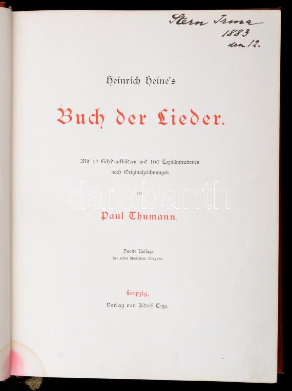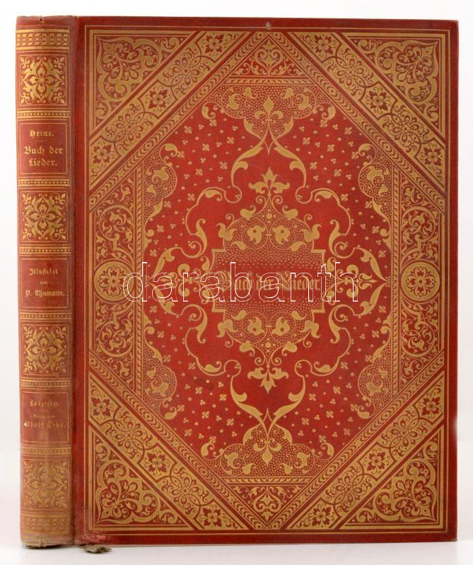 Heinrich Heine: Buch der Lieder. Illustrirt von P. Thumann. Zweite auflage, der ersten illustrirten ausgabe. Leipzig, 1883, Adolf Titze, 134 p. Kiadói aranyozott vörös egészvászon kiadás, aranyozott lapélekkel. Német nyelvű kiadás, P. Thumann képeivel illusztrált kiadás. A lapok foltosak! / Golden gilded cloth-binding, with golden gilded margins, in german language, it illustrated with P. Thumann's pictures, the pages are spotty.