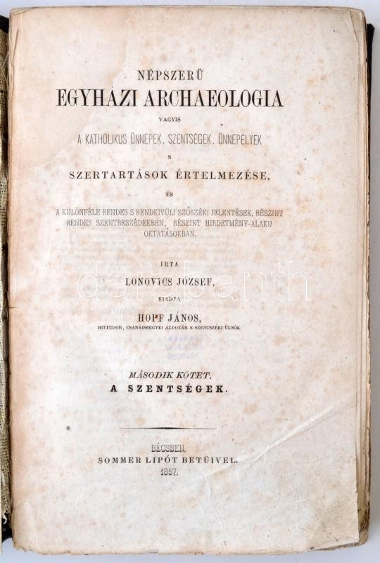 Lonovics József: Népszerű egyházi archaeológia vagyis a katholikus ünnepek, szentségek, ünnepélyek s szertartások értelmezése, és a különféle rendes s rendkívüli szószéki jelentések, részint rendes szentbeszédekben, részint hirdetmény - alaku oktatásokban. II. kötet : A szentségek. Bécs, 1857, Hopf János. Sommer Lipót betűivel. Műbör kötés, 451 p. Átkötött példány! Volt könyvtári példány! Megviselt állapotban. A kötése sérült. A lapjai foltosak.