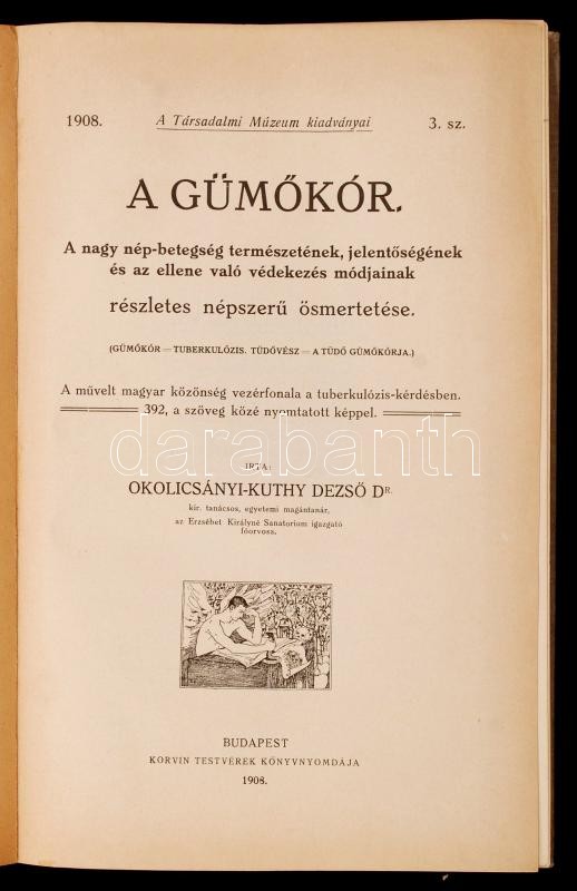 Dr. Okolicsányi-Kuthy Dezső: A gümőkor. A nagy nép-betegség természetének, jelentőségének és az ellene való védekezés módjainak részletes népszerű ösmertetése. A Társadalmi Múzeum kiadványai 3. 392 fekete-fehér fotóval illusztrálva. Budapest, 1908, Korvin Testvérek Könyvnyomdája. Kiadói egészvászon borítóban, 366 p. A borítója kopott, foltos. Az elülső szennylapon tulajdonosi névbejegyzés. A kötése meglazult, sérült.