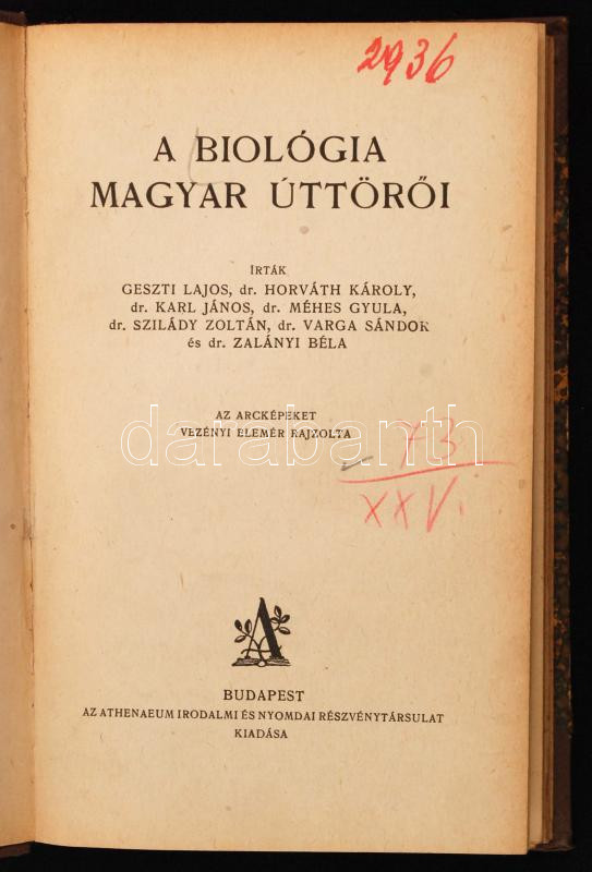 Description: Geszti Lajos, Horváth Károly, Karl János, Méhes Gyula, Szilády Zoltán, Varga Sándor, Zalányi Béla: A biológia magyar úttörői. Bp. Athenaeum. 236 p. Természethistória I. Korabeli félvászonkötésben