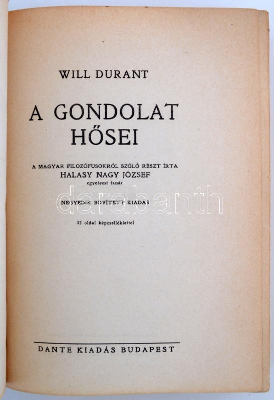 Will Durant: A gondolat hősei. Bp., 1943, Dante. Kiadói félvászonkötés...