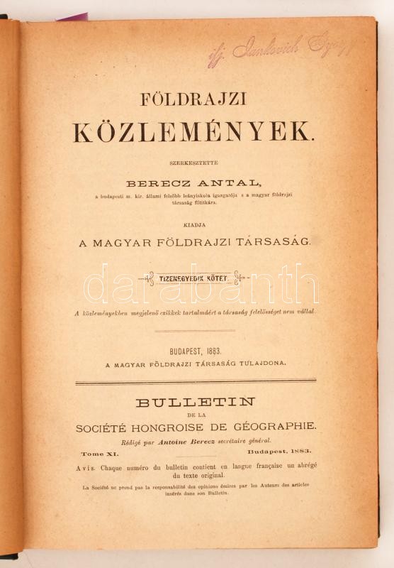 Berecz Antal (szerk.): Földrajzi Közlemények 11. Budapest, 1883, Magyar Földrajzi Társaság, 8+506+130 p. Néhol kopottas félvászon kötés.