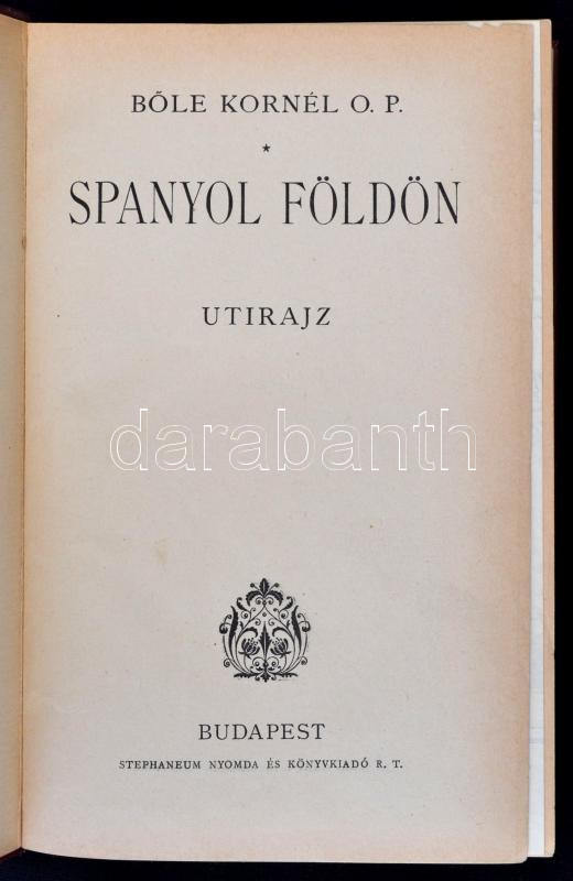 Böle Kornél: Spanyol földön. Útirajz. Budapest, é.n. [1927] , Stephaneum Nyomda és Könyvkiadó R. t, 472 p. Kiadói egészvászon kötés. Fekete-fehér fotókkal, és egy kihajtható térképpel.