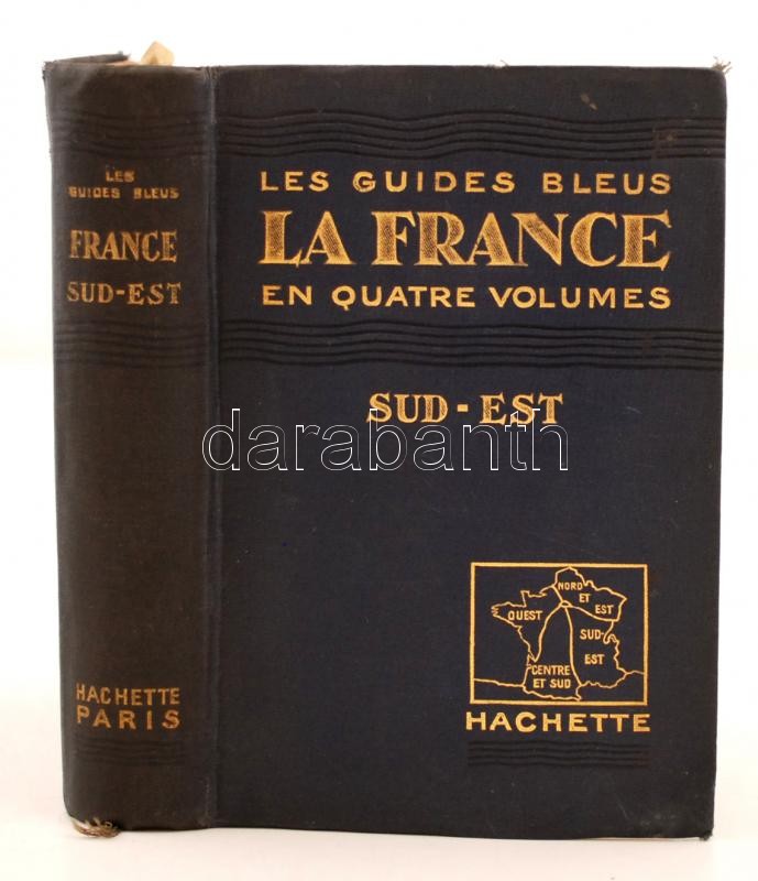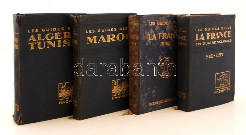 Les Guides Blues francia nyelvű útikönyv sorozat 4 kötete. (La France - Sud-est, La France - Quest, Maroc, Algérie-Tunisie.) Patronages officiels: Touring Club de France, Office National de Tourisme, Club Alpin Francais. Paris, 1925-1927-1928, Librairie Hachette, XLVIII+519+XXXIX+469+CXI+495+XVIII+431 p. Kiadói aranyozott egészvászon kötés. Térképekkel illusztrálva. Francia nyelven. Változó állapotban, többségében viseltes. / Cloth binding, in french language. In mixed quality, but main part is poor shape.