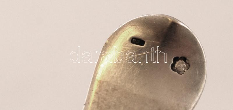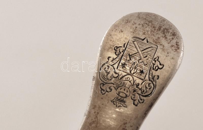 Ezüst (Ag.) fagylatos kanál, jelzett, mesterjeggyel (VCD), gravírozott címerrel, h:14 cm (2×), nettó:55 g
