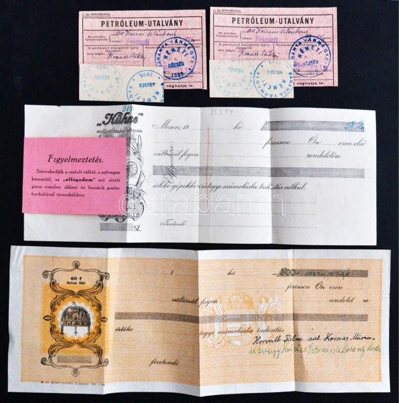 ~1940-1941. 2db klf váltó illetékbélyeggel, bélyegzéssel + "Petróleum-utalvány" "BARANYA VÁRMEGYE NÉMETI KÖZSÉG 1908" bélyegzéssel T:II-,III