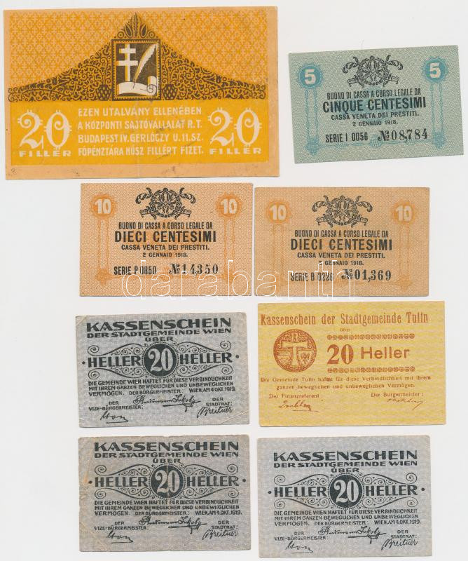 8db-os vegyes szükségpénz és bankjegy tétel, közte Budapest 1919. 20f ...