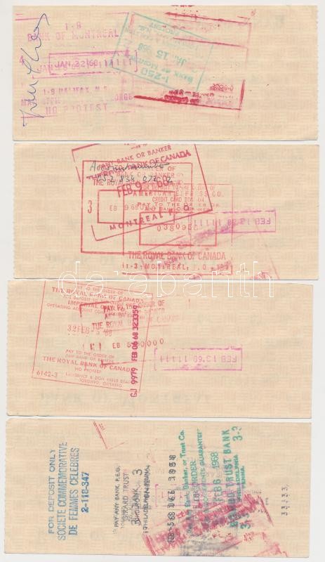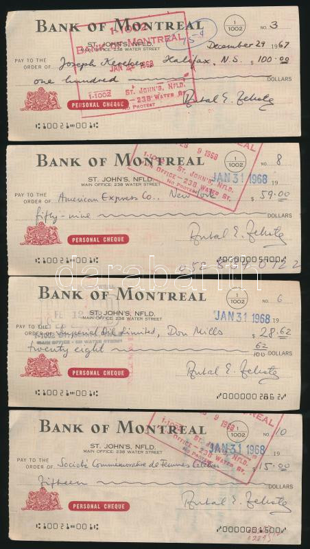 Kanada 1968-1969. "Bank of Montreal" kitöltött, bélyegzett csekk (4x) T:II Canada 1968-1969. "Bank of Montreal" filled, stamped cheques (4x) C:XF