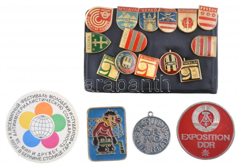 18db vegyes külföldi jelvény, medál a szocialista időszakból, közte NDK "NDK kiállítás" festett Al jelvény, Csehszlovákia "Rózsahegy" műgyantás fém jelvény T:2,2- 18pcs of mixed socialist badges, medals, with GDR "GDR Exhibition" painted Al badge, Czechoslovakia "Ruzomberok" metal badge C:XF,VF