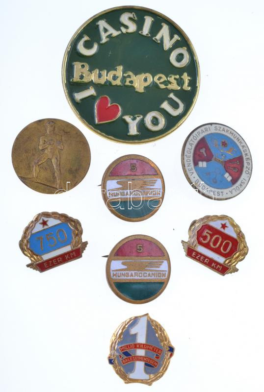 ~1970-1980. "500 ezer km" zománcozott fém jelvény balesetmentes közlekedésért + "750 ezer km" zománcozott fém jelvény balesetmentes közlekedésért + "1 millió km balesetmentesen" zománcozott fém jelvény + DN "Vendéglátóipari Szakmunkásképző Iskola" zománcozott fém jelvény + DN "Hungarocamion 5" zománcozott fém jelvény + DN "Casino I Love You - Budapest" zománcozott jelvény + DN Bokszoló fém jelvény, tűhiány T:2,2-