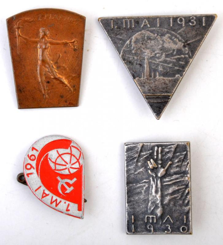 Ausztria 1927. "Május 1." Br jelvény, "Pittenwerke, Wien XIII." gyártói jelzéssel. Szign.: Weiberger (24x30mm) + 1930. "Május 1." ezüstözött Br jelvény, "BEHA WERK XIII." gyártói jelzéssel. Szign.: Mynni (20x28mm) + 1931. "Május 1." ezüstözött Br jelvény (32x36mm) + NDK 1961. "Május 1." zománcozott fém jelvény (18x25mm) T:2