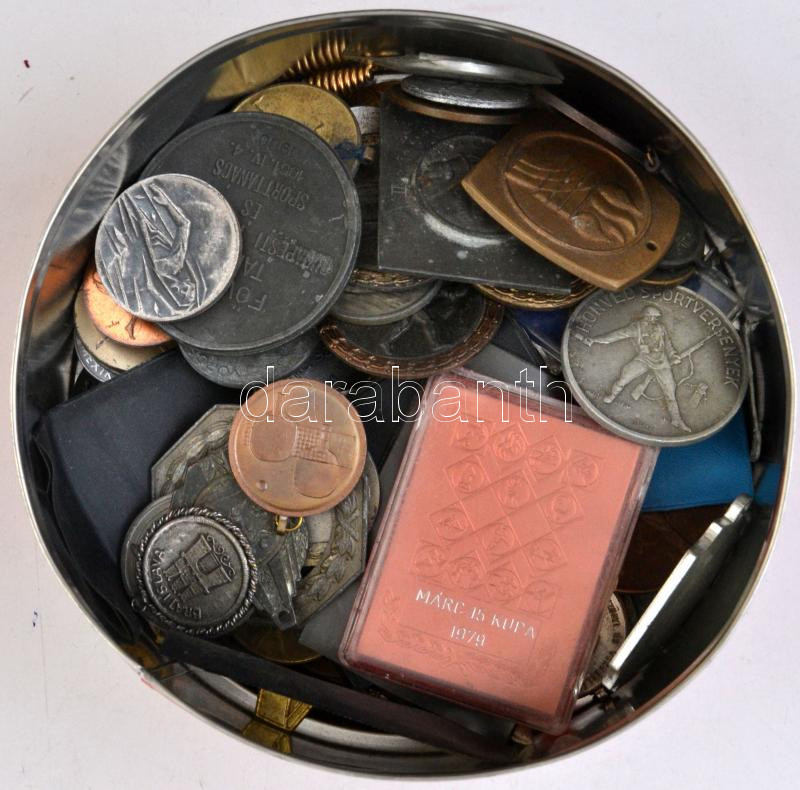 Egy doboznyi vegyes sport díjérem, közte Iván István (1905-1968) 1951. "Váltófutás a Felszabadulás ünnepére / Fővárosi Tanács - Budapesti Testnevelési és Sporttanács 1951. IV. 4." Zn díjérem (66mm), "1960" véséssel, 1969. "Magyar Úszószövetség - Országos Gyermek Bajnokság II." fém díjérem. Szign.: Kovács (40mm), 1987. "Farkas Mátyás Veterán Emlékvereseny" négyzetes alakú Br díjérem (49x54mm), 1945. "A Magyar Ifjúság Napja 1945. június 10. / MADISZ" Zn díjérem (30mm)
