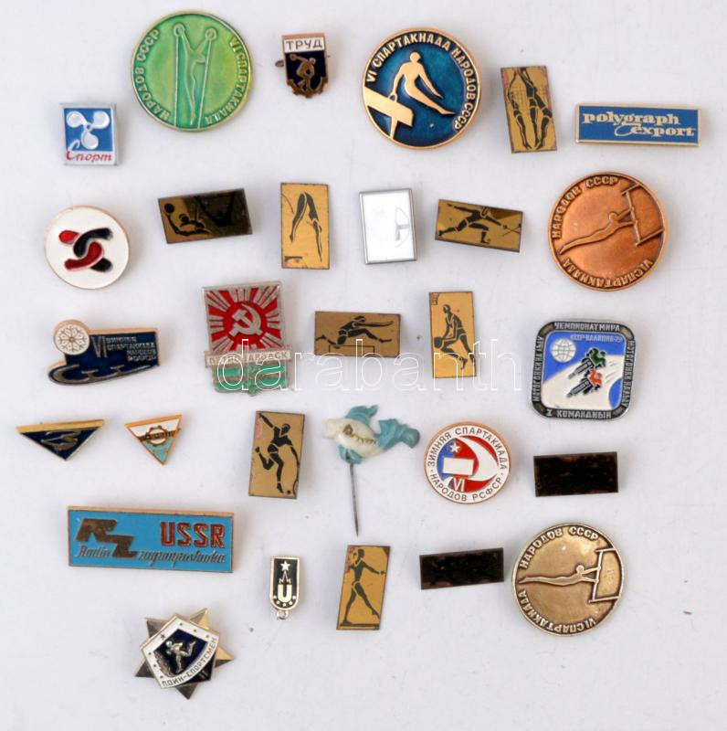 Szovjetunió DN 29db klf sport témájú jelvény és kitűző, köztük zománcozott darabokkal T:2,2- Soviet Union ND 29pcs of diff sport themed badge and pin with enamelled ones C:XF,VF