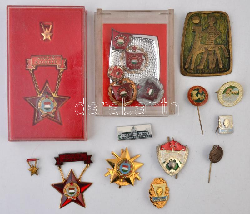 Vegyes 16db-os klf kitüntetés, jelvény, sapkajelvény és kitűző tétel, közte DN "Kiváló Dolgozó" zománcozott fém kitüntetés eredeti tokban, miniatűrrel, DN "Szocialista Brigád" zománcozott fém plakett tokban (48x58mm), "Budapesti Természetbarát" zománcozott fém jelvény (25mm)