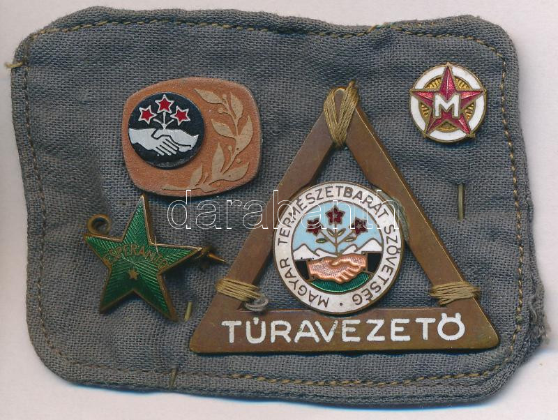 Vegyes 4db-os jelvény és kitűző tétel, közte DN "Esperanto" zománcozott fém jelvény (17mm), DN "Magyar Természetbarát Szövetség - Túravezető" zománcozott jelvény tű nélkül, felvarróvá átalakítva T:2