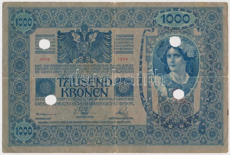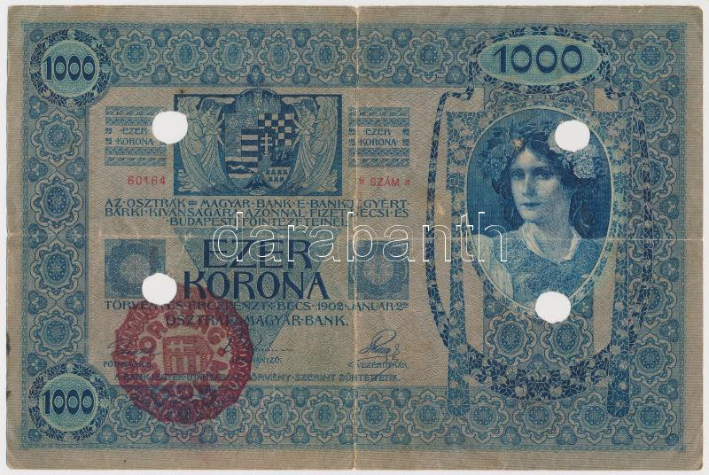 https://www.darabanth.com/en/271-Online-auction/271.0/Numismatics/Hungarian-Banknotes~300007/1902-1000K-MAGYARORSZAG-piros-felulbelyegzessel-lyukasztassal-ervenytelenitve-TIII--Ada~II1370049