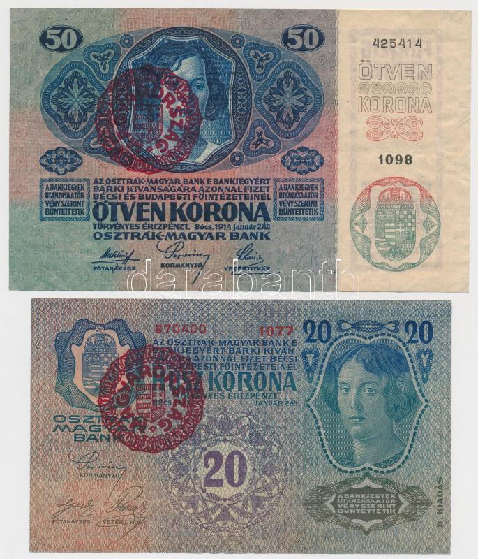 https://www.darabanth.com/en/271-Online-auction/271.0/Numismatics/Hungarian-Banknotes~300007/1913-20K-plus-1914-50K-mindketto-piros-MAGYARORSZAG-korbelyegzessel-TII-III-szep-papir~II1370136