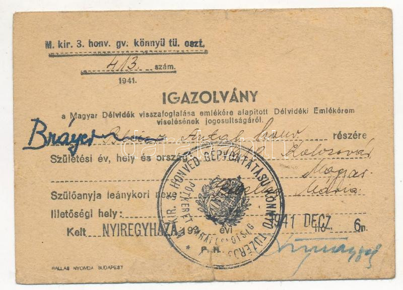 https://www.darabanth.com/en/271-Online-auction/271.0/Numismatics/Military~300016/1942-Delvideki-Emlekerem-kituntetes-viselesere-jogosito-igazolvany-rajta-kis-szakada~II1376774