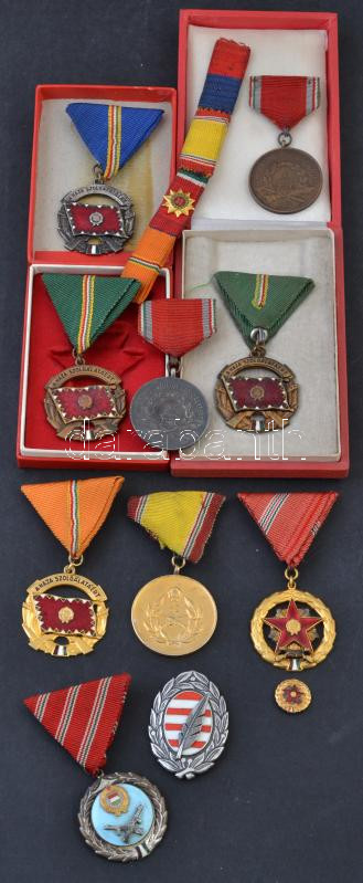 Vegyes 10db-os militária tétel, a Magyar Néphadsereg kitüntetései, egy sapkajelvény, szalagsávok és két tok, közte 1964. "Kiváló Szolgálatért Érdemrend" zománcozott fém kitüntetés, mellszalaggal és sérült miniatűrrel T:2
