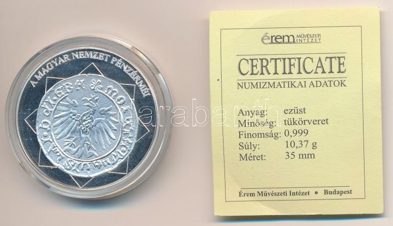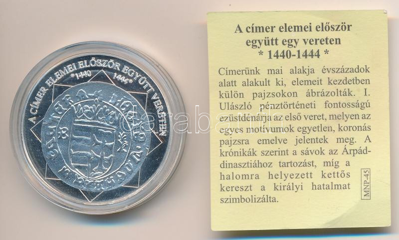 DN "A magyar nemzet pénzérméi - A címer elemei először együtt egy vereten 1440-1444" Ag emlékérem tanúsítvánnyal (10,37g/0,999/35mm) T:PP